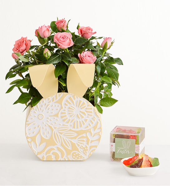 NEW Add a dash of whimsy to their Easter with this bunny-shape planter. Along with curvy rabbit ears, the yellow planter is decorated with a white embossed floral motif. It arrives bearing a pink rose plant, budding and ready to bloom. Make the gift even sweeter with the addition of bunny-shape gummy candies in an acrylic box with the message “Hoppy Easter.”